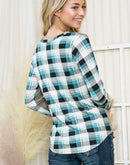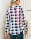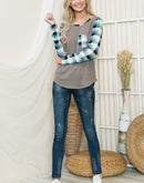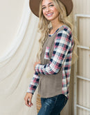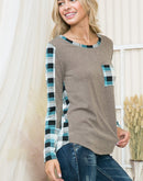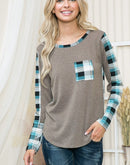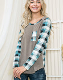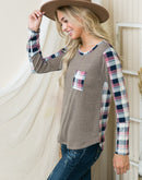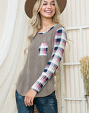 Knit Jersey plaid print contrast on light sweater knit. Front pocket detail crew neck.