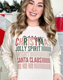 Graphic long sleeve features a distressed design with various Christmas sayings with checkerboard patterns. This trendy top is perfect for Christmas!