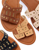 Handmade slide sandals with rivet stud details and a padded insole.