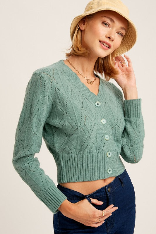This cardigan sweater redefines versatility with its crochet knitting detail and scallop edge design. Crafted with meticulous attention to detail, the V-neck adds a touch of sophistication, while the scallop edge on the front r...